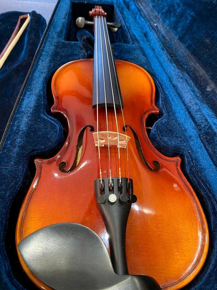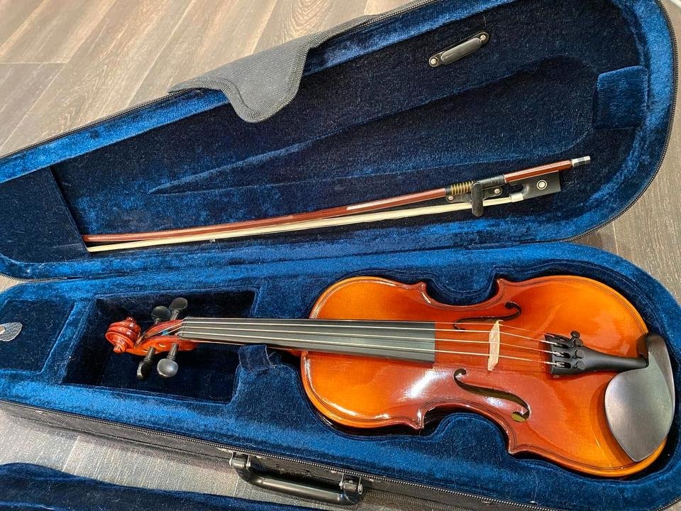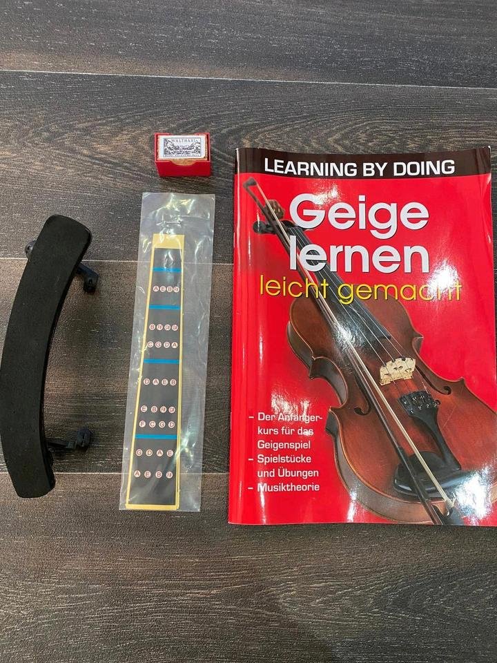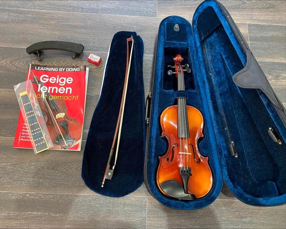 So gut wie neuKommt mit einem Koffer mit Rucksackriemen, der Geige und dem Bogen, Kolophonium, Schulterstütze, Griffbrettmarkierungen und dem Buch „Geigen lernen leicht gemacht“.Das Kolophonium und Buch haben Gebrauchsspuren